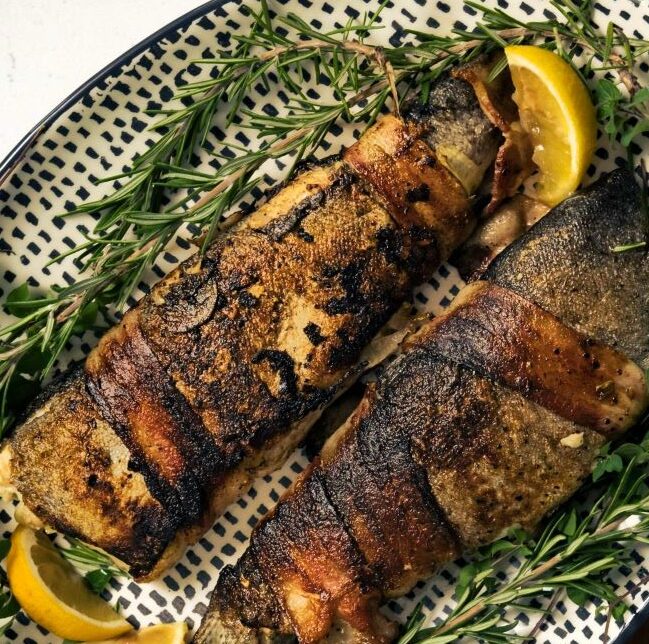 2 pstruzi, 2 lžíce másla, pepř, sůl, čerstvý tymián, 1 citron, 1 lžíce oleje