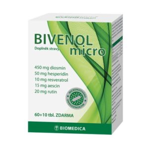 Doplněk stravy BIVENOL micro obsahuje mikronizované částice diosminu a hesperidinu. Přípravek také obsahuje extrakt kaštanu koňského, který přispívá k normální činnosti cévní soustavy. BIVENOL micro je dále obohacen resveratrolem, který přispívá k normální činnosti kardiovaskulárního systému, aescinem z kaštanu koňského a rutinem. Zakoupíte v lékárně nebo na: www.bio-medica.cz.