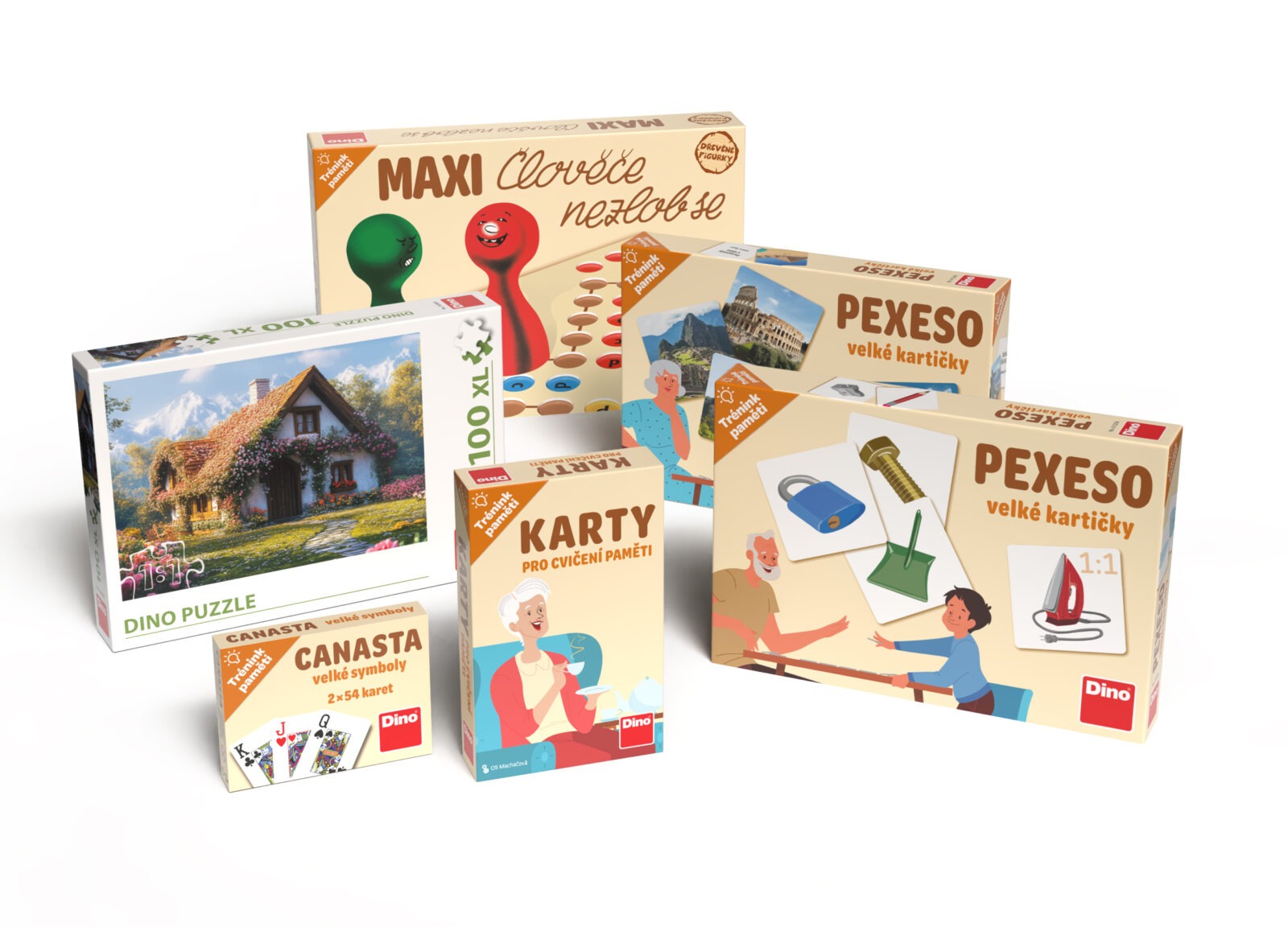 Česká rodinná firma Dino představila novou řadu Trénink paměti, sadu her a pomůcek navržených přímo pro potřeby seniorů. Velké písmo, větší dílky a jednoduchá, uklidňující grafika umožňují pohodlné hraní i těm, kteří už nemají pevnou ruku ani ostříží zrak. Hry dokážou zázraky – přirozeně udržují mozek aktivní, probouzejí dávné vzpomínky, a především vyvolávají radost ze společně strávených chvil.